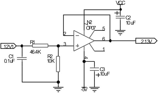 信号调理电路主要对输入的电源检测信号进行滤波、分压及阻抗匹配等处理。滤波的目的是滤除检测信号中的高频毛刺,通过试验可以看到,天线电源信号中常有幅度很大的干扰毛刺,如果不滤除可能会对器件造成损坏,或者影响检测精度。分压的目的是对检测信号的幅度变换,使其满足后级A/D变换器的输入要求,设计的关键是既保证信号的幅度不超出A/D的输入要求,又要尽量提高信号的分辨率。阻抗匹配电路是一个射极跟随器,目的是进行前后的阻抗匹配,提高检测的精度。图2是12V检测电压的调理电路。