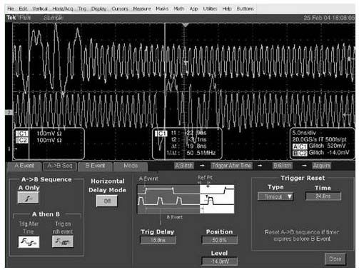 大多数示波器提供了辅助触发系统或“B”触发器,允许用户定义范围更宽的条件。B触发器等待主(褹)触发发生,然后在越过自己的边沿门限时触发采集。这两者可以结合使用,以设置某些相当复杂的触发条件。例如,A可能在设备时钟输入线路上检测到一个毛刺,如果在输出上遇到上升沿或下降沿,可以触发B。如果没有这种转换,那么毛刺可以忽略。这两套条件结合使用,可以确定毛刺是否会引起不想要的状态变化。