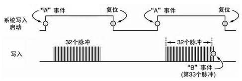 本系统中,读/写电路中的一个单元设计成在每个有效系统写入启动(WE)周期中执行一串32条写入命令。图2描述了较大的周期时间与导致数据写入的各个脉冲的关系。