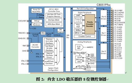 CMOS逻辑门的动态功耗可写为:P = C × V2 × f,其中C为负载电容,它是设计和工艺技术的函数;V为供应电压;f则是开关频率,它是应用处理需求的函数。电源电压是控制功耗的主要手段,因此若能像C8051F9xx内含低压差 (LDO) 稳压器一样,直接在芯片中增加电压转换功能,就能提供稳定的1.8V电压给微控制器的数字核心 (参考图2),使动态功耗大幅下降。