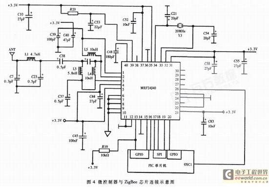 如图4所示,PIC单片机通过SPI总线和一些离散控制信号与MRF24J40相连。控制器充当SPI 主器件而MRF24J40充当从器件。控制器实现了IEEE 802.15.4 MAC 层和ZigBee 协议层。它还包含了特定应用的逻辑。它使用SPI 总线与MRF24J40收发器交互。通过较少的连线即可实现无线通信功能。