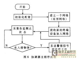 图6是协调器节点的主程序流程图。当协调器建立了一个新网络后,终端设备(无线红外入侵检测节点)请求加入该网络。当设备成功加入该网络后,协调器定时采集各检测节点的检测数据。当检测到有物体入侵时,协调器将被入侵的监控点信息(房间号)传送到监控主机,安防人员可实时查看到监控点的安全情况并做出反应。
