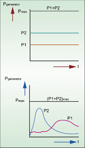 这些好处可以通过油泵的例子展示出来。不论车速多高,油泵和发动机所消耗的功率都在80到250瓦之间,具体数值同设计有关。发动机输出设计成在全速状态下需要最大流量燃油。当引擎闲置时,多余的燃油通过安全阀返回到油箱,此时操作油泵只需要几瓦的功率(图2)。因此如果油泵能设计成按实际需要提供燃油,那么该发动机的平均功耗将被减少到5瓦到50瓦之间,具体数值取决于油泵容量。