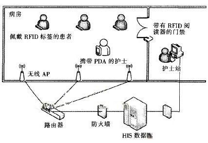 医院数字化基于RFID的无线护理信息系统工作环境如图1所示 病区内部署无线局域网,根据PDA工作范围部署无线AP(Access Point)。患者佩戴RFID标签带,护士携带带有RFID阅读功能的PDA.通过无线网络与HlS进行信息交换。护士根据患者的标签确定患者身份,同时在执行医嘱时实现药品等的确认,并将医嘱由谁执行、医嘱何时执行和患者体征数据等通过PDA录入到H1S当中。同时,在病区安装门禁系统,患者出入病区能够自动地反应在护士站上,便于管理。