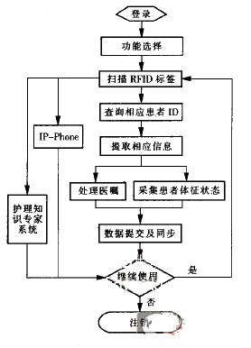 流程中,首先进行登录和功能选择。然后根据所选模块完成对医嘱执行全过程的监控,或者选择基于WIFl的IP—PH0NE功能。如果要实现信息查询,则进入护理知识专家系统。所有操作最终完成后,注销系统。