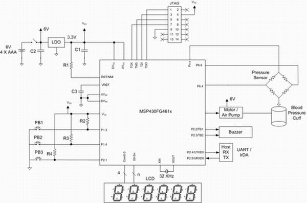MCU 中PWM 输出控制的直流电马达对袖袋进行充/放气。这是该血压计唯一用到 6V 电源驱动马达的地方。如果不能满足电源需求,整个血压计可以用一节 3V 锂离子钮扣电池供电。不过,目前只有少数马达可以靠这种高阻抗钮扣电池驱动,所以,此例可以使用4节普通低成本AAA碱性电池及低压降稳压器 (LDO) 为MCU提供 3.3V电源。假设每天测量两次血压,这些电池可以使用两年。MCU可以长期工作在活动显示计时模式,原因是该模式的电流消耗非常小。另外,用户查看存储的血压读数时也不会增加电流消耗。此外,集成的双通道 DAC能够产生相移180°的正弦波,从而可以提高变送器性能。