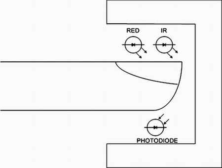 心率监视和脉搏血氧计采用的技术不止一种。本文着重介绍非侵入式光学体积描记技术。此类血氧计采用配有MCU的外部探头,能够显示血氧饱和度及脉搏率。在此应用中,同一个传感器可同时用作心率检测及脉搏血氧测量。该技术提供了估测动脉血氧饱和度和心率的简单而精确的办法。探头置于指尖、耳垂和鼻子等身体不同位置。探头包含两个发光二极管(LED),其中一个发射可见红光(660nm),另一个发射红外线(940nm)(见图 3)。光束通过人体组织到达光电检测器。在通过人体组织时,红血球中的血色素会吸收部分光线,吸收量因血氧饱和度的不同而不同。首先,通过测量对两个波长光线的吸收量,MCU能够精确计算出氧化的血色素比例。其次,通过人体组织的光线中含有因心跳造成动脉血量不同而产生的脉冲分量。