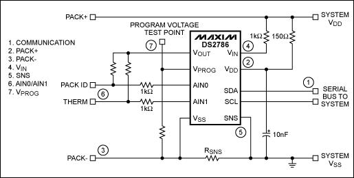 下文给出了一个安装电池包之前测试基于DS2786 OCV电路板的例子。图1为电路板的电路原理图,用到了DS2786的所有功能。图中所有重要的测试点(共7个)都用带圈数字标出。测试流程假定电路中的所有分立元件已经过测试,因此,测试目的为确认线路连接,从而验证安装的电路板是否正确。