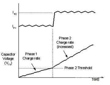 电源管理器件的可编程特性支持用户实现更高的优化控制技术,而几乎没有或增加额外的成本。这样的技术实例是在两个不同的阶段对电路板上的电容充电,小电流的初始阶段和大电流的最后阶段,如图4所示。