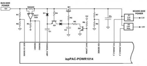为了支持热插拔,印刷电路板等部件必须能够可靠地执行几项操作,其中电源管理最为关键。当电路板插到较大系统时,分配给其他系统和使这块电路板初始化之前,电路板的热插拔控制器必须确保连接器的电源是稳定的。对于板上流过小电流,可以用MOSFET数字开关来切换电路板上的电源。对于更大的电流(例如10安培的电流),则需要采用更复杂的开关策略,以避免引起总线级电源瞬变,导致损坏MOSFET电流开关。使系统级性能达到最高要求具有顶级热插拔管理功能与低级别的开关控制功能间的紧密协调,如时序和故障检测。虽然有可能用硬连线的电路实现这样的系统,使用可编程系统器件往往是更简单和有成本效益的。