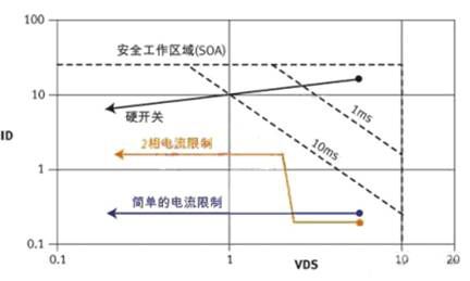 图2 MOSFET的安全工作区域(SOA)图说明了器件在漏极-源极电压和漏极电流组合下的安全极限。不同的控制策略可以用来避免当MOSFET用作热插拔负载开关时被过分驱动。