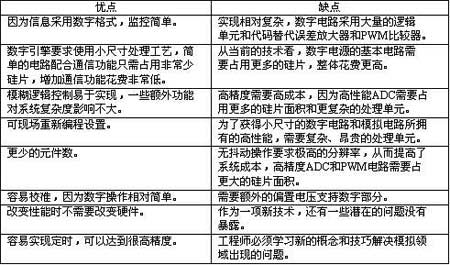 一种新技术的引入通常需要一个过渡过程,在这个过程中,用户不断地检验新技术中实际可行的因素和不切实际内容。本文旨在澄清模拟与数字电源管理之间的不同。从多方面考察两种技术差异及其对系统性能的影响。表1、表2分别列出了各自的优、缺点: