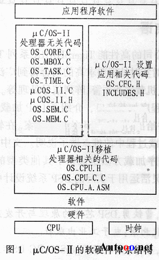 图1示出μC/OS-II的软硬件体系结构。从图中可以看出,要实现μC/OS-II的移植,必须为其编写OS_CPU.H、0S_CPU_C.C和OS_CPU_A.ASM 3个文件,这3个文件都与处理器的硬件特性相关,提供任务切换和系统时钟功能。其余源文件的代码都是公开的,可以直接从μC/OS-II的官方网站下载。
