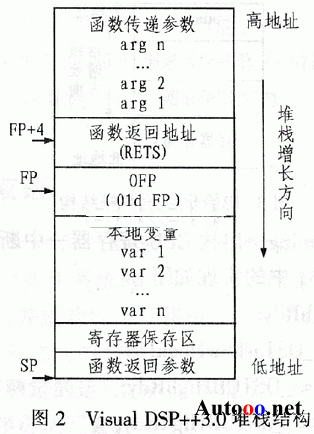 μC/OS-lI的移植要求用户在OS_CPU_C.C文件中编写6个简单的C函数,其中主要是完成OS-TaskStkInit (),其余5个函数可以不作处理。OS-TaskStkInit()负责任务堆栈的初始化,使得任务堆栈看起来就像刚发生过中断并将所有的寄存器保存到堆栈中的情形一样。不同的编译器在函数调用时有不同的入栈方法,因此在具体实现时必须根据处理器的编译环境进行调整。VisualDSP++3.0在函数调用时的堆栈结构如图2所示。