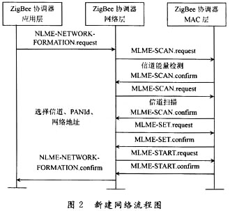 软件设计基于T1公司推出的ZigBee协议栈的最新版本Z-Stack 1.4.2。ZigBee网络设备根据功能的不同可以分为协调器、路由器和终端节点。终端节点申请加入网络,成为协调器或者路由器的子节点后,可以主动向网络中的任何节点发送数据报,也可以询问它的父节点是否有发送给它的数据报并接收。路由器包含终端节点的所有功能,此外还可以作为父节点允许其他节点加入网络,给网络中的其他节点路由转发数据报,对逻辑网络地址进行分配,维护邻居设备表等。协调器除了包含路由器的所有功能外,还包括创建一个新网络的功能。新建网络的流程如图2所示。