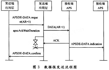 协调器通过NLME-NETWORK-FORMA-TION.request原语来启动一个新网络的建立过程。然后网络层请求MAC层对协议所规定的信道或由物理层所默认的有效信道进行能量检测扫描,以检测可能的干扰。网络层收到成功的能量检测扫描结果后,以递增的方式对所测量的能量值进行排序,并舍弃那些能量值超出许可范围的信道。如果网络层找到了合适的信道,则为新建的网络选择一个PAN标识符,接着选择0x0000作为协调器的网络地址。当网络层选定网络地址后,通过向MAC层发送MLME-START.request原语完成ZigBee网络的创建过程。ZigBee网络支持星型网、簇状网和网状网3种网络结构,其中网状网的任意两个网络节点之间都可以进行通信,发送数据报的流程如图3所示。