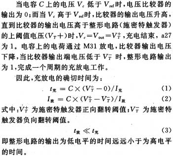 CMOS随机振荡器电路的工作原理图如图3所示。M1~M5,M7,M8,R1构成了单位增益缓冲器,使,决定了振荡器的充电电流基I1(I1=Vo/R1),在设计时可以调节R1的大小实现对充电电流基I1的调整。M10~M18构成了电压比较器,利用M18,M19电流镜产生单端输出Vout。由M25产生镜像电流I2,对时间常数电容C充电。随机电流充电电路由随机控制信号(V1~V4)随机打开M27~M30管,由于镜像的作用,电容C充电电流变大,加快电容C充电速度,即改变了振荡器的频率。在电路中M21~M24各管的宽长比比值设计为8:4:2:1,使振荡器的振荡频率可以完全覆盖某一频率范围,从而保证该振荡器在某一频率范围内连续随机变化。