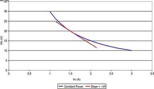 电压-电流线呈现出一定的斜率,其从本质上定义了电源的动态阻抗。这根线的斜率等于负输入电压除以输入电流。也就是说,由 Pin = V·I,可以得出 V="Pin/I";并由此可得 dV/dI=–Pin/I2 或 dV/dI≈–V/I。