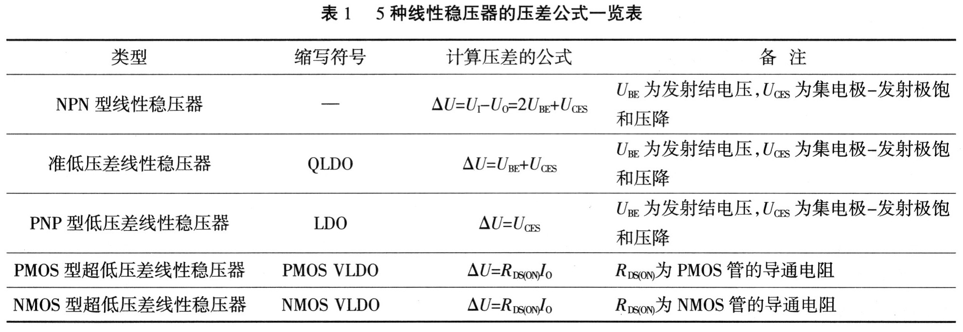 上述5种线性稳压器的压差计算公式如表1所列。
