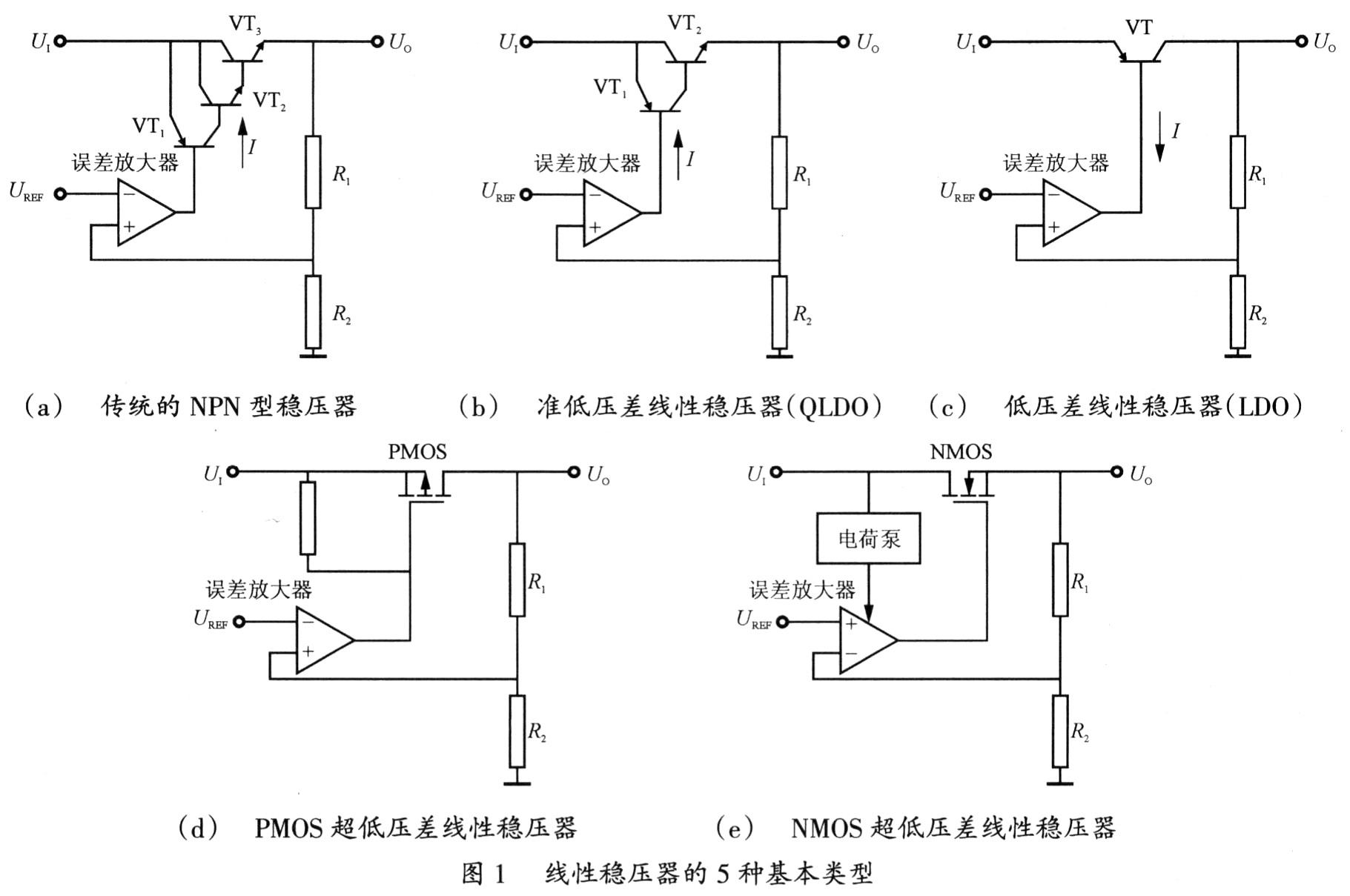 线性稳压器的5种基本类型如图l所示。其中图1(a)为传统的NPN型线性稳压器,其输入一输出压差超过2.5~3V,I为驱动电流(下同)。其中图1(b)为准低压差线性稳压器(QLDO,Quasi Low Dropout Linear Regulator),其压差可减小到0.9~1.5V。其中图1(c)为PNP型低压差线性稳压器(LDO,Low Dropout Linear Regulator),其压差仅为0.3~0.6V。图l(d)为由P沟道MOS管构成的PMOS超低压差线性稳压器(VLDO,Verv Low Dropout Linear Regulator),其压差可降至100mV左右。图1(e)为由N沟道MOS管构成的NMOSVLDO,其压差压差可低至几十毫伏。