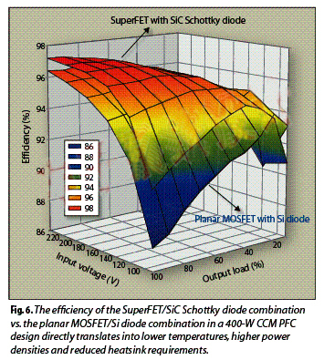 图5所示为开关损耗一览,将SuperFET与SiC肖特基二极管组合后,可有效减少开关损耗。与平面型MOSFET相比,SuperFET能够降低21%的关断损耗。与速复二极管相比,SiC二极管能够降低61%的开通损耗。当然,使用SiC肖特基二极管代替速复硅二极管与传统的MOSFET组合,可以使MOSFET的关断损耗降低78%,使其开通损耗降低23%。图6所示为不同器件组合的功效测量结果。从图中不难看出,在整个运行范围中,MOSFET/SiC肖特基二极管的组合对提高功效起到了很重要的作用。甚至在大电流时(满负荷低输入电压),改善的效果也很明显,在同样的情况下,MOSFET/SiC肖特基二极管组合的功效比传统器件高出4%。对于开关损耗的分析证明,通过减小SiC肖特基二极管的反向恢复电荷来减低MOSFET开通损耗,是提高功效的主要途径。最终结果是增加了CCM PFC下的功率密度。