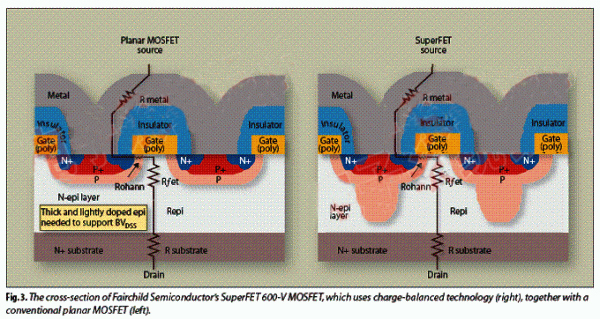 图3所示为Fairchild Semiconductor(飞兆开云棋牌官网在线客服)公司的SuperFET 600-V MOSFET的横截面,它运用了电荷平衡技术(右),另一个是传统的平面型MOSFET(左)。一开始便引起我们注意的差异是SuperFET元器件内部的加厚p型柱。SuperFET所提供的低导通电阻所起的作用(>90%)在于N-型漂移区。加厚P型柱的作用是限制MOSFET轻掺杂外延区的电场。相比传统的平面MOSFET,n-型外延层的电阻率急剧减少,同时保持击穿电压不变。高压MOSFET的导通电阻降低后,可比传统的