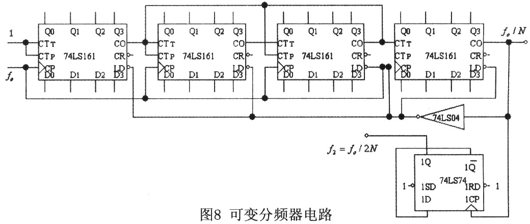 可变分频器由集成四位二进制同步加法计数器74LS161来完成。这里采用4片74LS161通过预置数的方法来实现可变分频。为提高工作速度,可采用图8所示接法。利用同步方案最高可实现65536分频。预制值=65536-N。经过可变分频后获得的信号是窄脉冲信号,在输出端可利用74LS74对该信号进行二分频,以便获得方波信号,从而满足相位比较器1的占空比要求。此时实际分频系数变为2N。电路如图8所示。