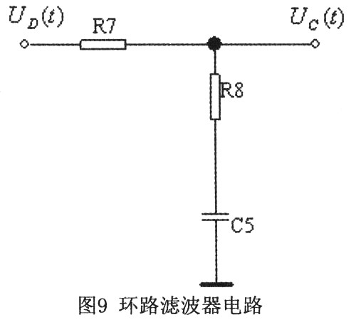 本设计选取无源比例积分滤波器作为环路滤波器,其时间常数T=(R7+R8)C5电路如图9所示。