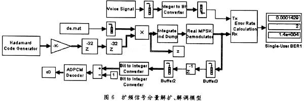 将de.mat数据解扩、解调,其误码率为1.429e-4,提高了3个数量级,性能大大改善。将除噪后的数字音频信号进行ADPCM解码,得到的时域图如7所示,再次进行聆听,能够较清晰地分辨语音内容,只存在极少数的背景噪音。如果还需进一步增强语音信息,可以采用信号特征提取等处理方法去除其他噪声,本文不再详述。