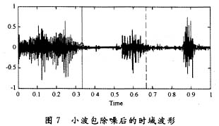 为了进一步突出小波包除噪效果,我们采用同样具有时域局部化特点的短时傅里叶变换方法代入实验程序,其除噪后的语音时域波形图如图8所示。