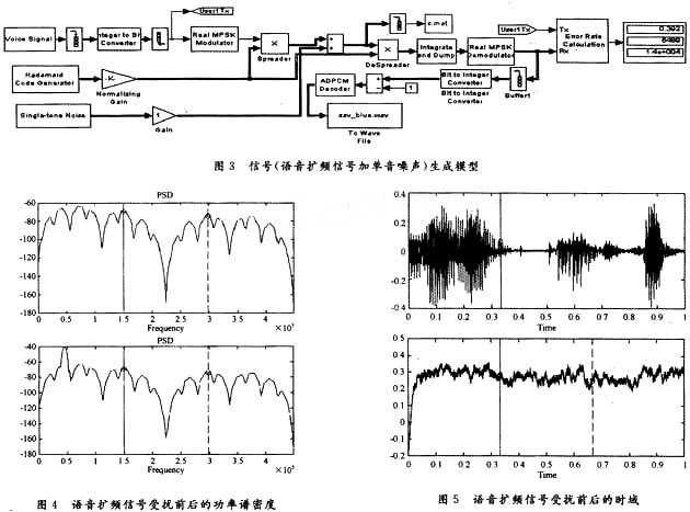 语音扩频信号混有单音频噪声前后的功率谱密度PSD如图4所示,受干扰前后的时域波形如图5所示。