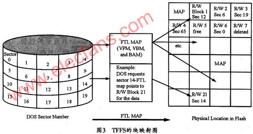 图3中,FTL层将DOS上连续的扇区映射到Flash上某个R/W block块中,同时在某个位置记录一个映射表(称为MAP表),该表中记录了DOS的扇区映射到Flash中的哪个block,当DOS要进行读操作时,FTL首先查询这个MAP,以获得映射信息,然后读取相应的block信息并返回给DOS,从而实现读映射。当DOS需要写入操作时,可能存在将bit0修改为1的情况,于是FTL层将申请一个新的block块,并将新信息写入,然后修改map信息,记录这个DOS扇区已经重新映射了,从而实现写映射。所以,从逻辑上看,FTL层就实现了DOS扇区的映射和FLASH的写入管理。