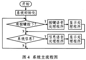 电梯在运行过程中,如果无人按键,电梯语音系统则自动播报广告、天气预报等信息,同时伴有点阵或液晶显示。当有按键按下时,语音系统则会根据按键值调用相应的按键语音处理程序。主程序流程图如图4所示。