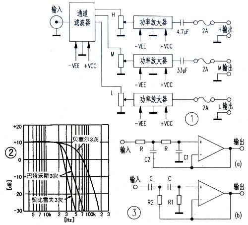 在前置放大器之后用有源滤波器分割频带,各频段有自己的功率放大器和扬声器,各频段的电平在各功率放大器之前用电位器调整。这种方式的优点是显而易见的,它取消了前述 LC 网络,又能有效地利用各个扬声器的效率;同时,也降低了对功率放大器的频率要求,输出功率也可以小一些;这种结构示于图 1 ,其关键电路是有源滤波器。