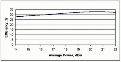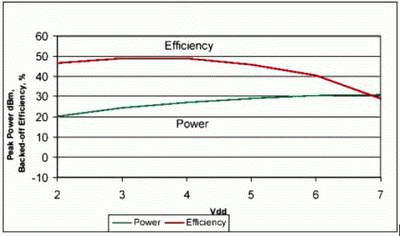 驱动级对总体功耗也有贡献。包括驱动级在内的功率添加效率(PAE)在7.8dB后退点处大于33%,此后退效率可以在广泛的电源中实现。图5显示了各种电源电压下放大器后退7.8dB时的效率,注意,确实有两种方式控制放大器的瞬时输出功率,即异相和改变电源电压。电源电压通常用于缓慢改变平均输出功率,相位角用于快速改变信号的瞬时包络线。