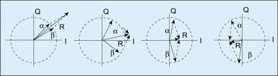 图1用矢量图显示了两个电压恒定、相位不同的信号α与β如何合并起来形成一个任意电压信号R,图2是采用异相技术的功率放大器结构示意。
