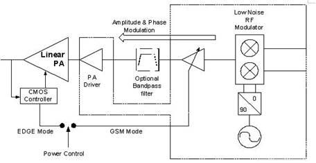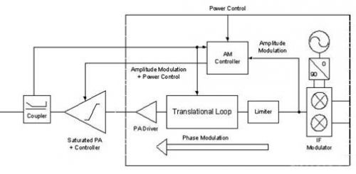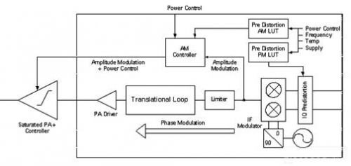 “极性”调制器的概念是为了保留平移环结构,因此保留上述全部优点。然而为了支持EDGE模式,还必需对调制器增加调幅(AM)能力:在调制器输出端去掉AM调制,馈送到幅度控制器,再馈送到高动态范围的VGA,从而再生成射频AM和PM复合信号。将该信号馈送到一个纯粹作为放大器的线性PA单元。由于PA没有得到补偿,所以它的线性度和动态范围必须非常高才能保证信号质量。当然,线性PA通常不如饱和PA的效率高。
