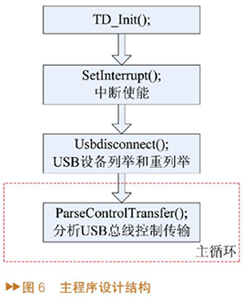 主程序Main.c主要负责USB接口芯片的初始化工作。主要有端口的初始化、中断的初始化、USB设备的列举和重列举等工作。Main.c的设计结构如图6所示。