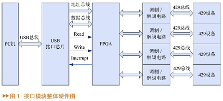 接口模块硬件部分由USB接口芯片,FPGA和调制/解调电路三部分组成。下面以一路429设备为例来介绍接口模块的发送和接收部分的硬件设计。