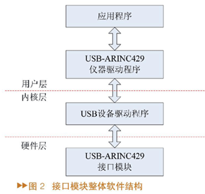 软件设计主要包括USB-ARINC仪器驱动程序,USB设备驱动程序以及底层USB固件程序的设计。软件设计整体框图如图2所示。USB-ARINC仪器驱动程序主要将应用程序与驱动程序之间的通信协议以及接口模块的硬件控制进行再次封装,并为应用程序提供接口,即API函数。USB设备驱动程序主要负责PC机与接口模块之间的数据传输。USB固件程序主要负责发送接口模块的控制命令,32位429总线数据字以及接收到32位429数据字后的中断处理。
