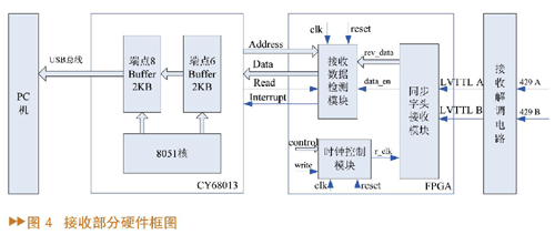 接收部分硬件设计框图如图4所示。接收部分主要作用是检测ARINC429总线上是否有数据,并当有数据时将并行的32位429数据字组装成并行的4个字节数据发送给PC机。