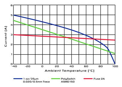 必须注意的是,在整个温度范围内,PPTC器件的触发电流是如何跟随印制线上的电流。在这两种情况中,即使可以使用熔断器,在汽车高于有用的标准温度下,尺寸最接近的熔断器也不能保护它。
