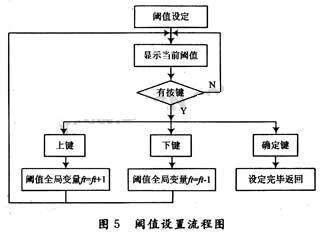 阈值温度ft为外部变量,在整个程序中都有效,每按一次“上”键ft=ft+1,按“下”键时ft=ft-1,检测位置的设定与其相似。阈值设置流程图如图5所示。