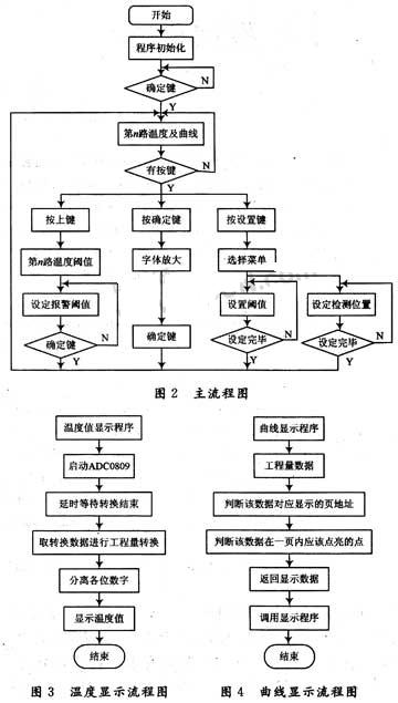 主流程图如图2所示。主要包括程序初始化部分,主要完成的任务是初始化液晶显示屏,初始化单片机各口状态和设初始阈值,检测位置为第一路;按确定键后系统开始工作,显示第一路位置的温度及其动态显示图的主页面;当按下设置键时,液晶屏幕显示一个选择界面,可选择设置检测位置,检测位置阈值;通过上下键可进行选择,选择界面的箭头指向设置位置时,按确定就可进入位置的设置,设置完毕后,确定健返回;直接再按确定键可显示放大的温度字体。