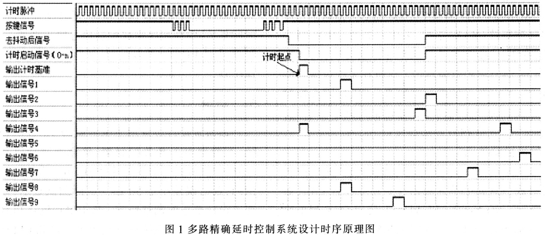 系统时序图如图1所示,在计时脉冲的驱动下,按键信号经去抖动变换、CPLD逻辑同步后形成计时启动信号(0一n),以计时基准脉冲的前沿为计时起点,经设定延时后,系统输出相应的输出信号,其延时时间可独立调整,信号输出形式可由软件编程设置。图l采用单一正脉冲作为输出信号。