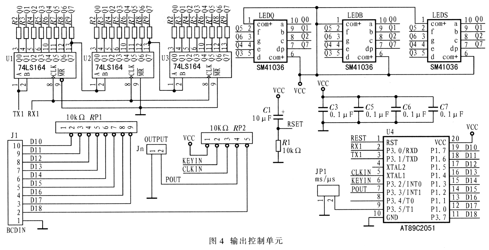 每个系统由n(本系统设计中n=9)个输出控制单元组成,这n个单元输出控制独立并行工作,如图4所示。N0.1~N0.n以ATMEL公司5l系列单片机AT89C2051为核心。AT89C205l是低功耗、高性能CMOS 8位单片机,具有15个双向输入/输出(I/O)端口、片内含2 K字节的可反复擦写的只读Flash程序存储器和128字节的随机存取数据存储器(RAM);采用ATMEL公司的高密度、非易失性存储技术生产,兼容标准MCS一5l指令系统。输出控制单元(NO.1~NO.n)并行工作,完成延时时间设置、μs/ms变换设置、控制信号输出和延时显示等功能,延时时间显示通过单片机串口实现,由3片串/并变换器件74LSl64驱动3个共阳数码管。