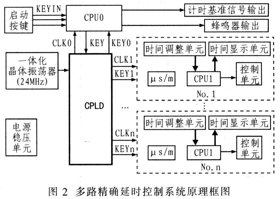 电源稳压单元实现系统5 V电源的稳压与滤波。单片机采用外部系统时钟。主控单片机CPUO完成按键检测、计时基准信号输出和系统提示声音输出等功能。NO.1~N0.n单元完成时间调整与显示、μs/ms(微秒/毫秒)变换和信号输出等功能,CPLD完成时钟2分频、同步计时脉冲输出和计时启动信号同步输出功能。图2为多路精确延时控制系统原理框图。