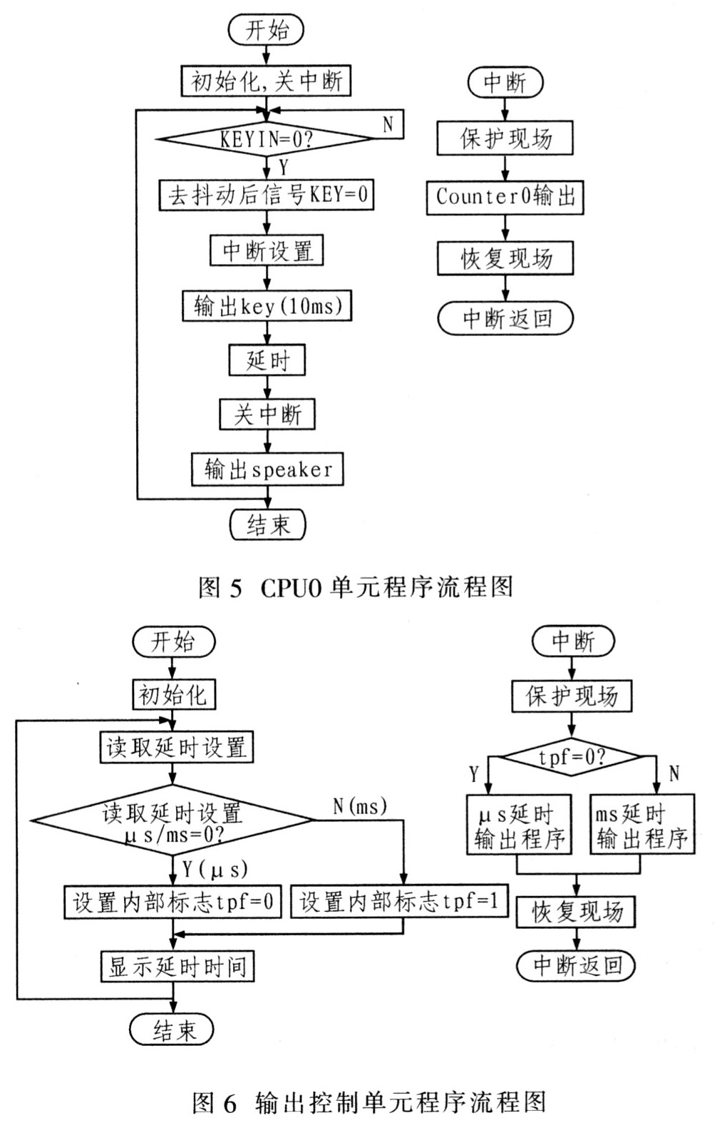 CPU0单元程序流程如图5所示。CPU0主程序完成系统初始化、按键检测、去抖动信号输出和工作状态提示音输出等工作,中断服务程序计时基准信号 counterO输出。输出控制单元NO.1一NO.n程序流程如图6所示,各单元主程序完成μs/ms设置检测,延时设置读取,延时时间显示,中断程序完成控制信号输出功能。CPLD程序采用VHDL语言编写,采用QHalftusⅡ软件编译仿真。
