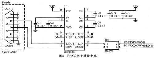 RS-232总线接口的总线收发器使用SP3232E。SP3232E系列芯片是一个2驱动器/2接收器的低功耗器件,SP3232E有一个高效电荷泵,工作电压为3.3 V时,只需0.1μF电容就可以进行操作。电荷泵允许SP3232E系列器件在3.3~5.0 V内的某个电压下发送符合RS-232的信号。由于本产品是3.3 V系统,因此使用SP3232E进行RS232电平转换,其电路图如图4所示。
