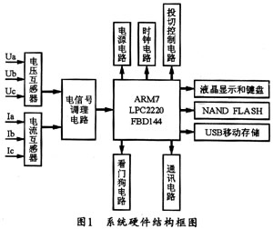 本装置的硬件结构框图如图1所示,它主要由数据采集、运算处理、数据存储、键盘显示、通信接口等单元组成。其中运算处理单元是核心部分,用于实现数据信号处理、快速傅立叶变换(FFT)等功能。考虑配电综合测控仪要求的运算速度、精度、硬件资源等需要,本设计选择了PHILIPS公司的LPC2220FBD144型ARM7芯片。